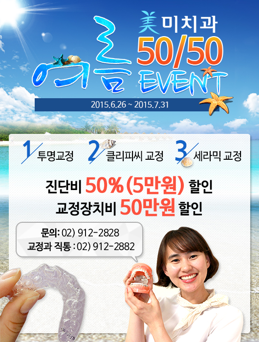 학생 여름 방학을 맞아 치아교정 할인 이벤트를 실시합니다~ l 진단비 50% 할인 (5만원) l 교정장치비 50만원 할인 (투명교정, 세라믹교정, 클리피씨 교정 등) l 이벤트 기간 : 2015.6.26 ~ 2015.7.30 일 까지 방문전에 예약부탁드립니다. 미치과 치아교정과 : 02)912-2828 교정과 직통 : 912-2882